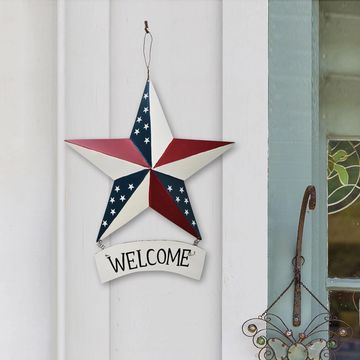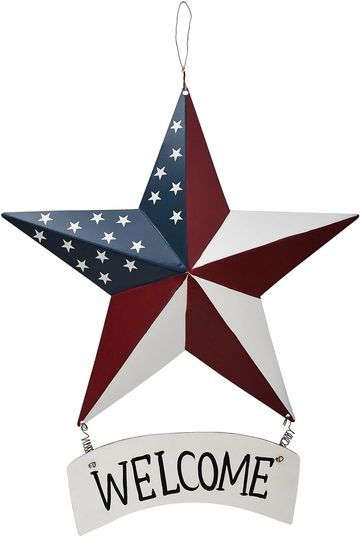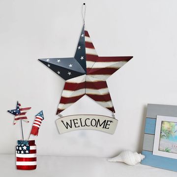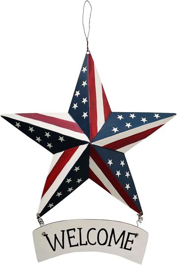 Metal Barn Star Welcome Sign Patriotic Decor Hanging American Flag Plaque Wall Art USA Porch Window Ornament Front Door Wreath Decoration for July 4th Independence Day Memorial Day Party (D) 12"x14", the metal barn star measures 12"